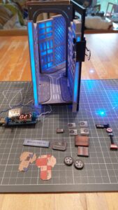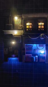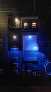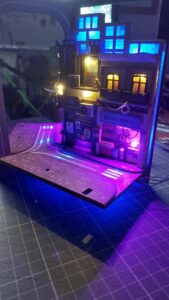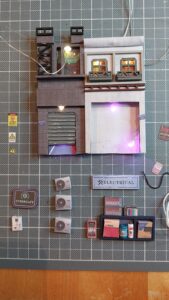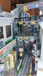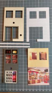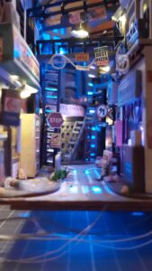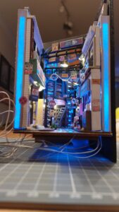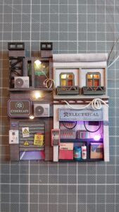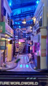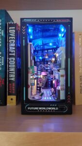 Bausätze sind sonst nicht mein Ding, meist kreiere ich “auf der grünen Wiese”, aber nachdem ich online einige tolle Book Nooks gesehen habe, hat es mich doch gereizt, eines zu versuchen. Das futuristische Erscheinungsbild von “Near Future” hat mir gefallen und auch die Beleuchtung sah auf den Fotos cool aus. Also ausgepackt und da schaust du mal – etliche Säckchen mit klein(st)en Teilen, Bögen zum Ausschneiden, LEDs, Kabeln und eine Anleitung, die auf sehr kleinen Bildern manchmal eher komplexe Tätigkeiten beschreibt …