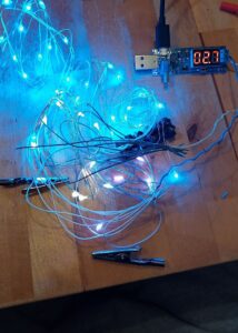 Der erste Schritt in der Anleitung war das Sortieren der LED-Kabel. Da gibt es unterschiedliche Farben und unterschiedliche Längen. Als Stromquelle war ein Batterieteil mit drei Knopfzellen dabei, da wurde mir gleich klar, dass das nicht meinen Anforderungen entspricht. Ich habe daher recherchiert und auf Temu einen einstellbaren Spannungswandler gefunden. Ich bin bei Elektronik nicht wirklich kundig, hab einfach die drei Euro riskiert 😉 und habe dann versucht, zu messen, wieviel die Batterielösung liefert und damit worauf ich die neue Stromversorgung einstellen muss. Tja, mein Messgerät kann nur Volt messen und nicht Ampere – schlussendlich habe ich einfach die Leuchtkraft der LEDs mit beiden Stromquellen verglichen und mich langsam auf ein ähnliches Ergebnis herangetastet um die LEDs nicht zu braten 😉