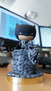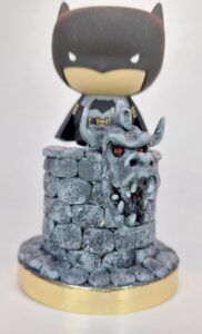 Wenn dir die beste Arbeitskollegin einen kopfschweren Batman geschenkt hat, der immer auf die Nase fällt, bedarf es einer Lösung. Ich hab ihm einen Turm “gemauert”, von dem er auf Gotham herabblicken kann – mit Wasserspeier. Batman konnte übrigens nichts dafür, dass er kippte, er war als Schlüsselanhänger konzipiert.